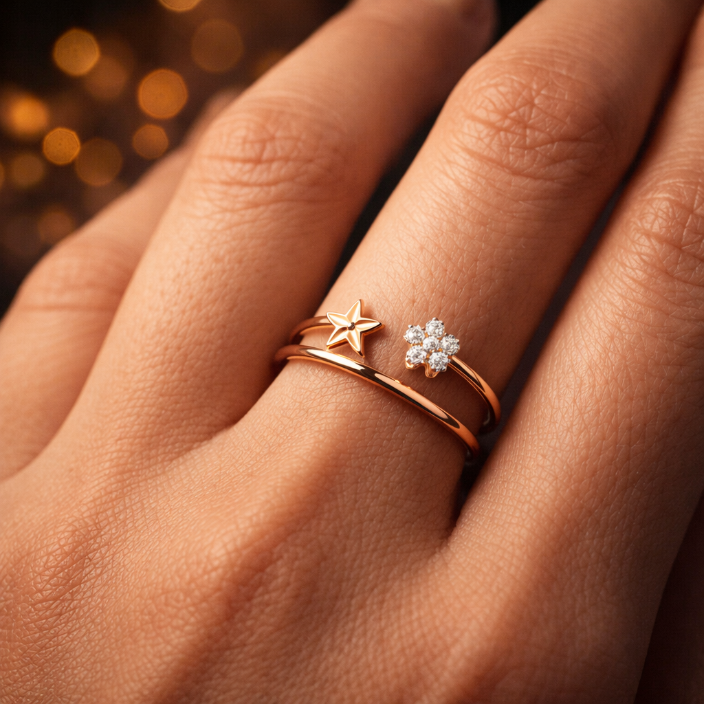 Designed with a delicate shimmering star, this ring symbolizes beauty, freedom, and brilliance. Its sleek golden finish with AD stones makes it perfect for everyday wear or special occasions, adding a graceful charm to any outfit.